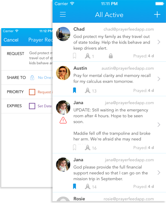 In a single app, a single screen, a single feed, you can view, create, share and pray for all of your Prayer Partners. Notify them immediately via push notifications, or create a prayer request just for you.